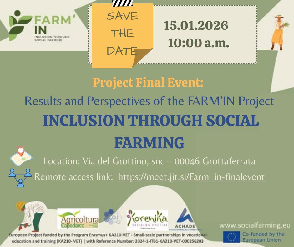Join us for the FARM’IN final event as we present the Erasmus+ project and share its results, key insights, and next steps about ‘INCLUSION THROUGH SOCIAL FARMING”